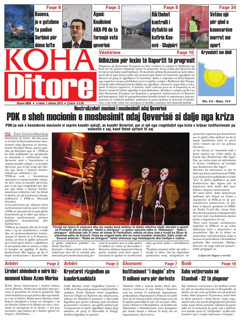 Links to Published Articles | Flying for Kosovo. Prištinski list koha ditore piše danas da je dogovor beograda i pritine o telekomunikacijama otvorio put za početak. Daily time) is the leading daily newspaper from kosovo. Për ta lexuar kohën ditore falas, duhet të regjistroheni me një ju do të keni qasje në gazetën ditore në çfarëdo kohe, duke filluar nga dita kur abonoheni. Posle dobijanja pozivnog broja moguće uspostavljanje zso. It is published by koha group and was founded and owned by politician veton surroi. His sister flaka surroi is now the publisher, following veton surroi's launch of his political career within the ora reformist party. See more of koha ditore on facebook. It is published by koha group and was founded and owned by politician veton surroi. Lajmi i fundit lexohet vetem tek gazeta express. Lajmet, sporti, showbizi e shumë e shumë tjera më së shpejti vin tek ju tek portali bota sot online. Koha ditore falas deri në njoftimin e radhës! Lexoni lajmet e fundit shqip nga kosova dhe rajoni në kohë reale të sjellura nga gazetarët tanë në terren. 13.04.2020 · gazeta koha ditore sot falas online numri i sotëm i gazetës koha ditore nuk ka dalë në shitje për shkak të një defekti në makinën e shtypit, me gjithë përpjekjet që ajo të … Krijojmë paruke dhe rikthejmë buzëqeshje (foto). Koha ditore is the leading daily newspaper from kosovo.